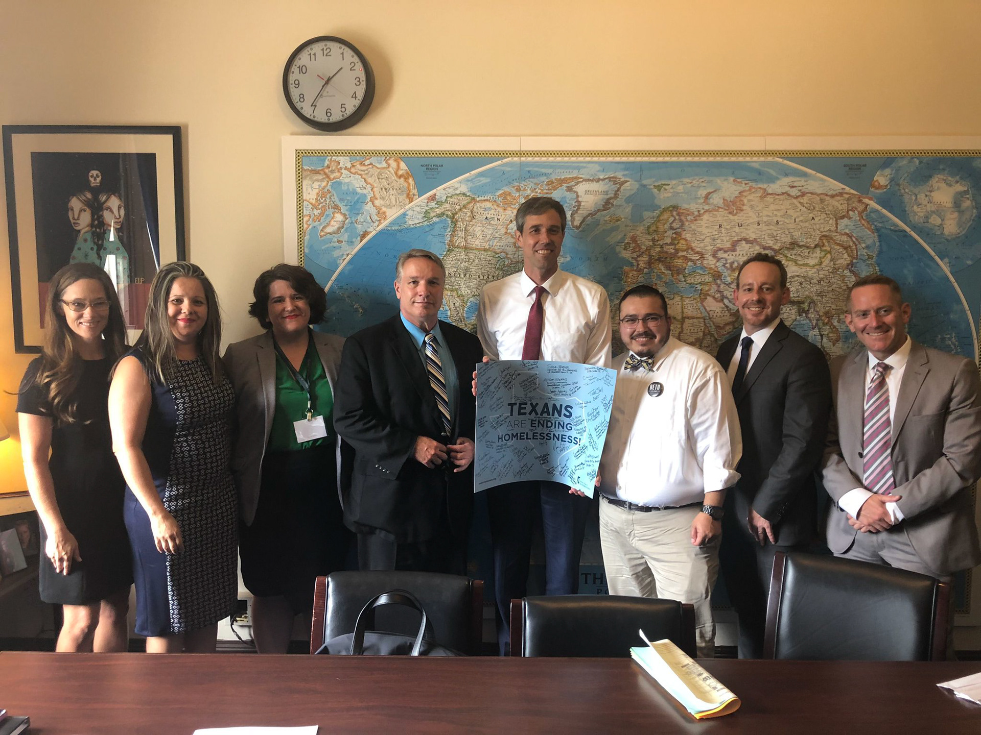 U.S. Representative Beto O-Rourke (D-TX) poses with advocates after receiving a sign for his office.