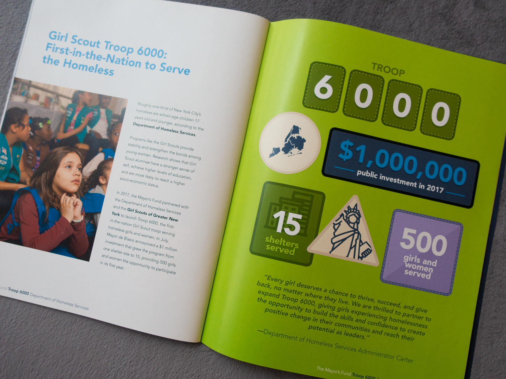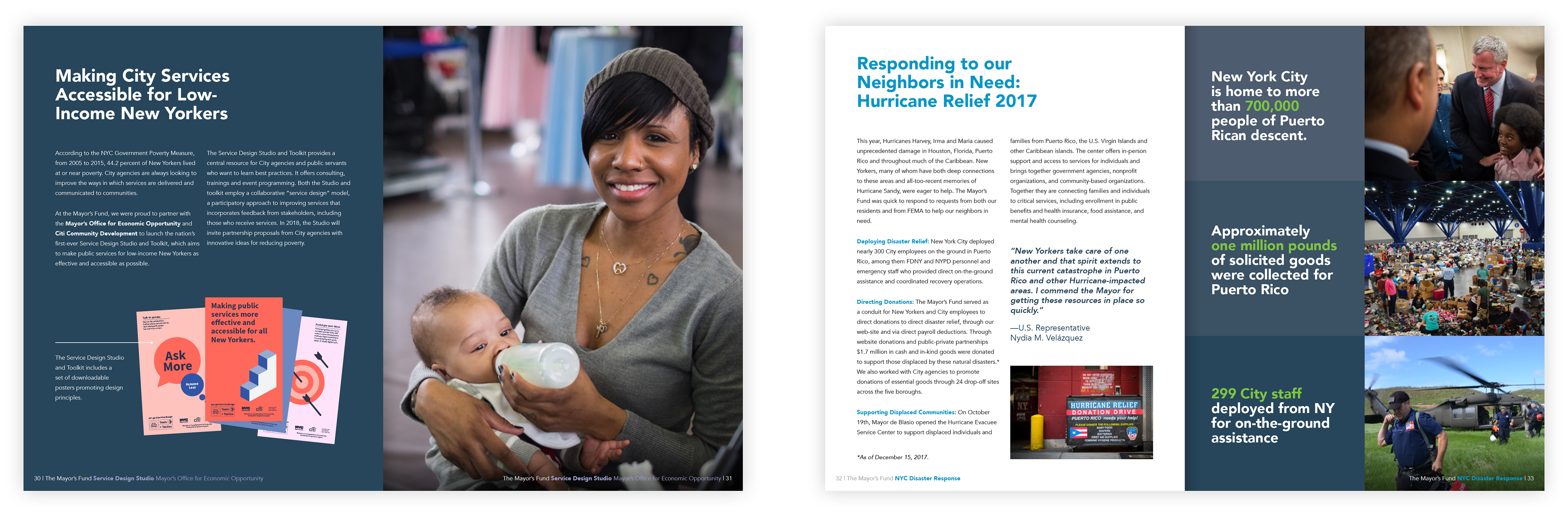 Print annual report design for the Mayor's Fund to Advance New York City. The Mayor's Fund is a not-for-profit organization working with over 30 City agencies and offices, 300 institutional funders, and 100 community-based partners to improve the lives of all New Yorkers. The Mayor's fund is directed by First Lady of New York City, Chirlane McCray.